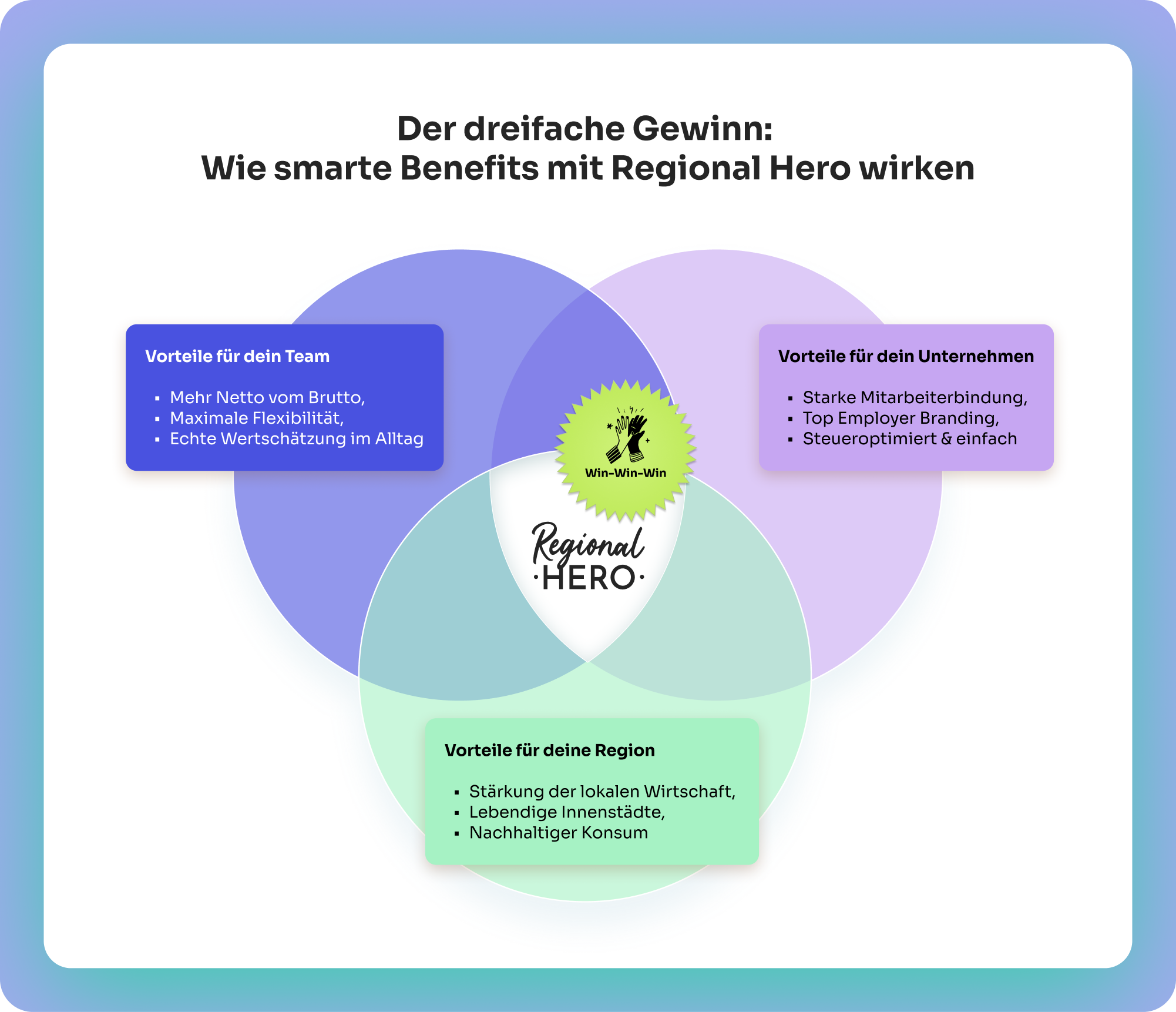 - Regional: Hier liegt die größte Chance, sich als Arbeitgeber einzigartig zu positionieren. Während die meisten Benefits "nur" eine Transaktion zwischen Unternehmen und Mitarbeiter sind, schafft ein regional ausgerichtetes System wie Regional Hero einen dreifachen Gewinn.