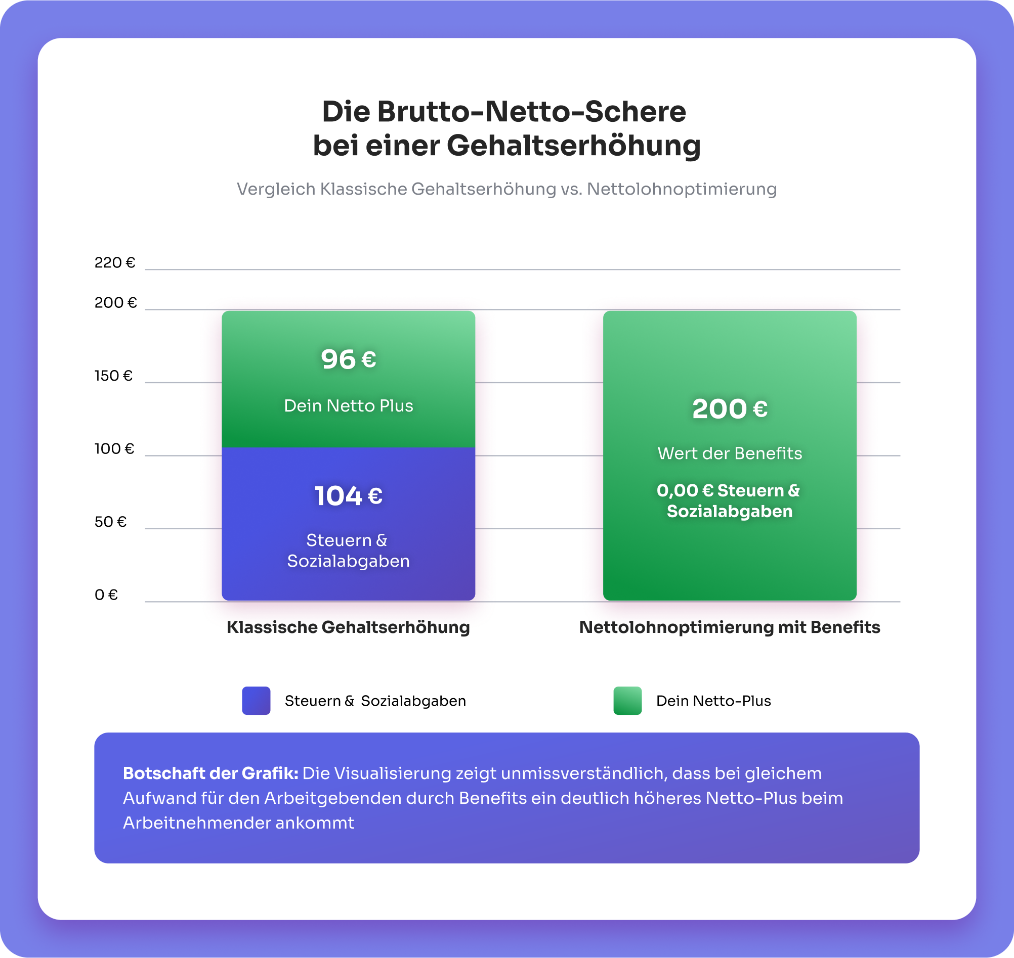 Nettolohnoptimierung bedeutet, das Nettogehalt durch steuer- und sozialabgabenfreie Zusatzleistungen (Benefits) anstelle einer klassischen Bruttogehaltserhöhung zu steigern. So kommen Gehaltsextras wie Sachbezüge, Zuschüsse oder Gutscheine 1:1 bei dir an, ohne Abzüge.